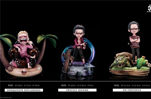 DX StudioResin + PUDonquixote Doflamingo: 18W(L) * 16D(D) * 11H(H) EstimatedDracule Mihawk: 11.5W(L) *9.5D(D) *13.4H(H) EstimatedSir Crocodile: 10W(L)*9D(D)*12.8H(H) EstimatedLimited to 99pcsShipping Date:Q1-2, 2026 Estimated