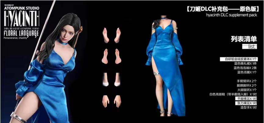 Brand: Atompunk StudioProduct Name: HyacinthScale: 1/6Date: Q1 20271. Head carving version:① : Normal movable eye head carving X 1 (blue eyes and green silk)② : Closed eye head carving X 1③ 2 pieces of PVC covering adhesive hair2. Doll costume:① Blue Evening Dress X 1 piece② : Two blue bubble sleeves X③ : Rabbit hair fur X 1④ 1 blue collar X⑤ : Two arm rings X⑥ : Ankle and ankle rings X 2 pieces⑦ 1 thigh and leg ring X3. Doll shoes:① White high heels (with half inserted foot) X 1 pair4. Doll hand shape:① : Relax your hands X 1 pair② : Styling Hand X 1 Pair③ : Weapon holding hands X 1 pair5. Character accessories:① Shoulder knife with X1 straps② X1 metal long knives③ 1 metal short knife X④ : Long blade sheath X 1⑤ : Short blade sheath X 1⑥ 1 pair of interchangeable one-piece legs (with 1 pair of white high heels)6. Platform accessories:① : Can store one octagonal platform X② : One character logo nameplate X7. Auxiliary accessories:① : Bracket X 18. Doll body:① : One self-developed large chest joint body X9. Mysterious little bonus:① Mysterious Small Accessories