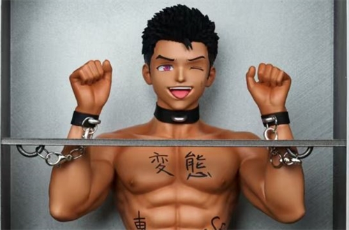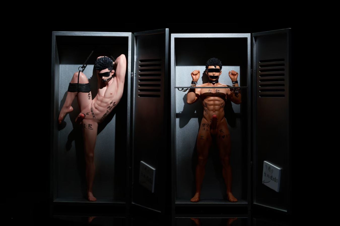 Brand:BDSM StudioProduct name:Original Character Black Skin 'Light'ES:90Scale:1:6Size:H30 W15CM*ConfigurationTwo heads+chain+cabinet(door can be opened and closed)+dicks*4