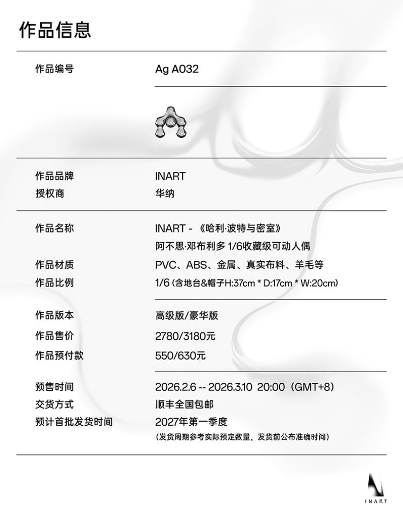 InArt presents the 1/6 scale figure of Albus Dumbledore , available in Deluxe and Premium versions , dedicated to the iconic headmaster of Hogwarts.The figure features a head with implanted hair and beard , articulated magnetic eyes that can be adjusted via magnets and internal levers, and a fully articulated body . Eight sets of interchangeable hands are included for recreating static and dynamic poses, including those for holding a wand and sword.The outfit includes a wizard's outfit , while accessories include glasses , a wizard's hat , the Elder Wand , the Sword of Gryffindor , books , a quill , an inkwell , and a table . The Premium version also includes Fawkes the Phoenix with a dedicated display stand .The product is completed by a display base , metal stand and a protective case for the implanted hair head.Pre-orders are open at $403 for the Deluxe Version and $459 for the Premium Version , with a release expected in Q1 2027 .
