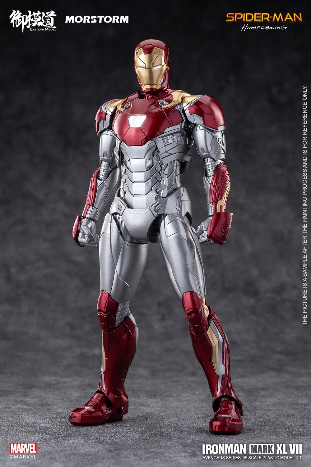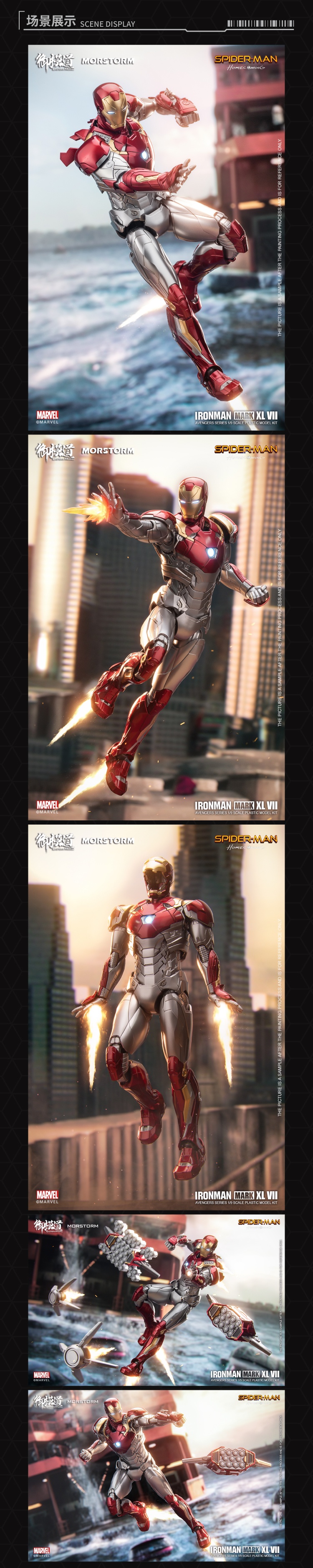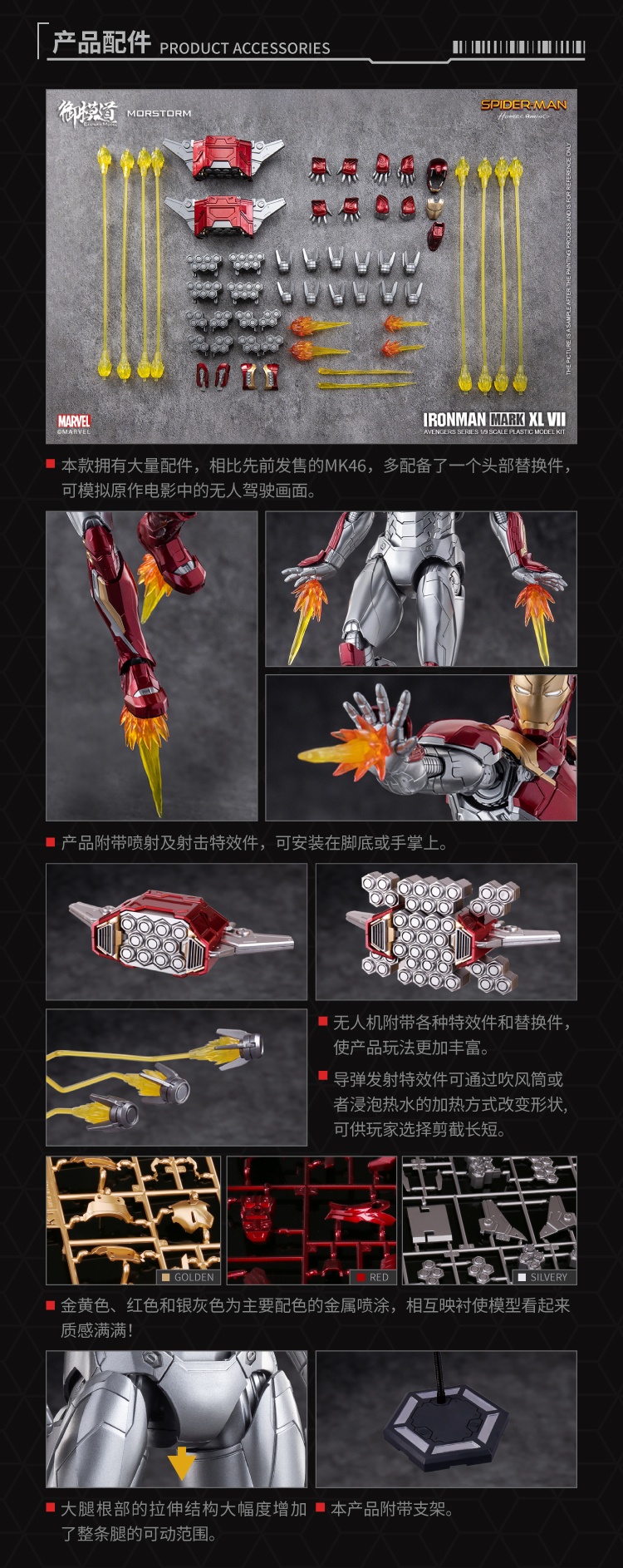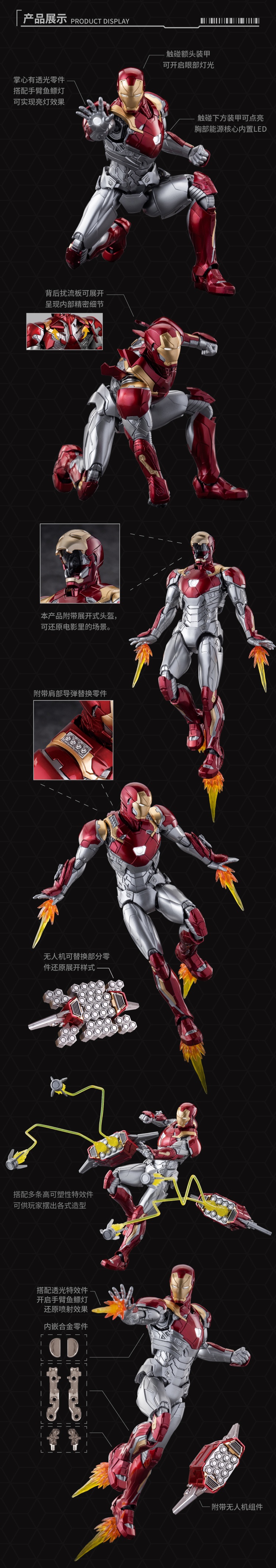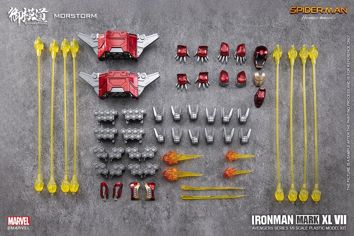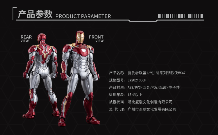 [The Royal Model Road Avengers Series]# 1/9 Iron Man MK47 Deluxe Edition#Iron Man MK47 Deluxe EditionProduct Details:Category: Assembled movable modelSeries: Marvel Assembled ModelHeight: 228mmPackage Contents:product material:ABS PVC Hardware POM Paper Electronic Parts Alloy Parts GlueConfiguration:Main body*1, expandable head*1Drone*2, Propeller Missile*12Replacement shoulder missile parts*2Replacement arm missile parts*2Hand*8, bracket, platformHand cannon effects*2, flight effects*4Booster Missile Link Effects*24Thruster missile connection UAV special effects *8UAV replacement parts*12, headlight electronic parts*1Chest lamp electronic parts*1, fish float lamp electronic parts*26pcs 1*3 magnets, 3M glue*1Sale information:Item number: EM2021008PPacking Quantity: 1 box of 8 boxesOuter box size: 75*62*44cmSingle box size: 42*30*18cmweight:Single box gross weight 20KGSingle box net weight 18KGProduct Pricing:Suggested retail price: 448RMB/boxReservation deposit: 200 yuan / box (the first batch is limited, first come first served)Deadline for order statistics: February 16, 2022 at 5:00 pm Estimated shipping time: the second quarter of 2022(The specific delivery time is subject to the manufacturer's delivery date)