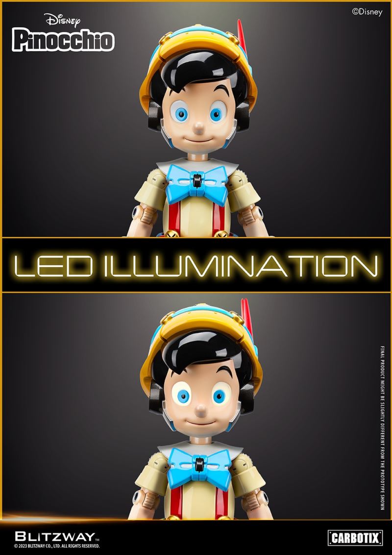 BLITZWAY New Product: Disney Carbotix Series - Pinocchio Pinocchio / PinocchioProduct Name: PinocchioLicensor: Disney Producer: BLITZWAYProduct Number: BW-CA-10506Product Series: CarbotixProduct Type: Non Scale Action Figure[Product Details]- Product Size (Approximately): 195mm (Product Only)- Product Weight (approx.): 500g (product only) / 1.2kg (including packaging) /15 kg (transport box/12 pcs) - Product Dimensions (approx.) > Packaging: W 313 mm x D 234 mm x H 140mm>Shipping Box: W 655 mm x D 500 mm x H 450 mm [12 pcs / 1 carton]*Actual dimensions and weight may vary.[Material]- Product: Die-cast, PVC, ABS, POM- Packaging: PET Blister, Color EPP + Color Box[Shipping Information]- Estimated Shipment: 1Q, 2024- Price: 149 $ (USD)- UPC ( Jan Code) : 8809321479852[Product Description]Blitzway unveils a new product Pinocchio from the famous Disney Carbotix series!Blitzway reinterpreted the puppet Pinocchio who longed to become a teenager at the structural level, emphasizing his unique vitality.In addition, this product adopts the ratchet joint that Blitzway's Carbotix series is proud of, which can make people feelstable and calm in the ratchet bump sound.Blitzway's Pinocchio not only has an exterior design that highlights the form of wood carvings, but also is equipped with a variety of replaceable parts, which can make various expressions andposes. Not only that, but also the signature long nose, faces with various expressions, donkey ears that support 360° rotation, eye LED lights, andPinocchio's reliable partner cricket Jimmy Cricket! Be sure to experience Pinocchio at Blitzway for yourself![Product Details]· Eyes with LED function· Can be used to highly restore the joint design of various action poses in the original animation· One (1) set of stickers and cards· Three (3) replaceable face parts· Three (3) One (1) set of replaceable eye partsTen (10) replaceable hand partsOne (1) set of donkey ear partsOne (1) JiminyBattery type: LR44 * 2pcs (not included in this product)[Important Notice]- Product details are subject to change without notice.-The final product is subject to change.[CREATORS]- Directors: Sungwoong Bae, HyuckChul Kwon- Planning: Won Choi- Executive Director: HyuckChul Kwon- Marketing: Won Choi, Inae Kang- Art Director: KA KIM- Art Consultant: Konkuk Kim- Product Designer: Konkuk Kim- Product Painting: Kwangse Oh- Painting Assistant: Hansol Yu, Deokhyun Kim- External Management: Jueun Lee- Modeling: BLITZWAY Casting Team- Concept Design: BLITZWAY Design Team- Management Support: Eric Lee, Lang Xu- Product Photography: Jonghwan Shin, Sanghyuk Yoon- Photography Editor: Zhou Hai, Sunghyun Kim- Packaging Design: Zhou Hai, Sunghyun KimThe BLITZWAY Design & Development TeamManufactured by BLITZWAY CO., LTD.Product Title : PinocchioLicensor : DisneyManufacturer : BLITZWAYProduct No. : BW-CA-10506Product Series : CarbotixProduct Type : Non Scale Action Figure[Product Detail]- Size Approx. : 195mm tall (Product only)- Weight Approx. : 500g (Product only) / 1.2kg (Including Package) /15 kg (Case Carton/12 pcs)- Dimension Approx.> Package : W 313 mm x D 234 mm x H 140 mm> Carton : W 655 mm x D 500 mm x H 450 mm [12 pcs / 1 carton]*Dimension and weight may change later.[Materials]- Figure : Die-cast, PVC, ABS, POM- Package : PET Blister, Color EPP + Color Box[Shipping Detail]- Estimate Shipment : 1Q, 2024- Price : 149 $ (USD)- UPC (Jan Code) : 8809321479852[DESCRIPTION]Blitzway unveils the new product in our popular Disney Carbotix line, Pinocchio!We have structurally interpreted the unique charm and gestures of Pinocchio, the wooden boy wholongs to become a real boy, to express his lively and playful personality. Moreover, by utilizing ratchetparts, one of the greatest strengths of the Blitzway Carbotix series, in the joints, you can experience astable and solid grip with the characteristic ratchet sound.The design highlights Pinocchio's distinctive wooden carving form, and with various interchangeableparts, you can create a wide range of expressions and poses for Pinocchio.The set includes face parts with different expressions, 360-degree rotatable donkey ears, subtle LEDlighting in the eyes, and even Pinocchio's trustworthy companion, Jiminy Cricket!Experience the diverse components included in the Blitzway Pinocchio product firsthand![Product Specifications]· LED function in the character’s eyes· Designed joints for posing various movements of original animation.· One(1) set of stickers and poster cards· Three(3) swappable Face parts· Three(3) swappable eye parts· Ten(10) swappable hand parts· One(1) set of donkey ear parts· One(1) Jiminy Cricket· Battery Type: LR44 * 2pcs (Not included)[NOTICE]-Production details might be subject to change without any prior notice.-Prototypes shown, final products may be slightly different.[CREATORS]- Producer: Sungwoong Bae, HyuckChul Kwon- Planner: Won Choi- Executive Director: HyuckChul Kwon- Marketer: Won Choi, Inae Kang- Art Director: K. A. KIM- Art Supervisor: Konkuk Kim- Product Designer: Konkuk Kim- Painter: Kwangse Oh- Assistant Painter: Hansol Yu, Deokhyun Kim- Public Relations: Jueun Lee- Casting: BLITZWAY Casting Team- Concept Design: BLITZWAY Design Team- Assistant manager : Eric Lee, Lang Xu- Photo: Jonghwan Shin, Sanghyuk Yoon- Editor of Photography: Zhou Hai, Sunghyun Kim- Package Design: Zhou Hai, Sunghyun KimThe BLITZWAY Design & Development TeamManufactured by BLITZWAY CO., LTD.