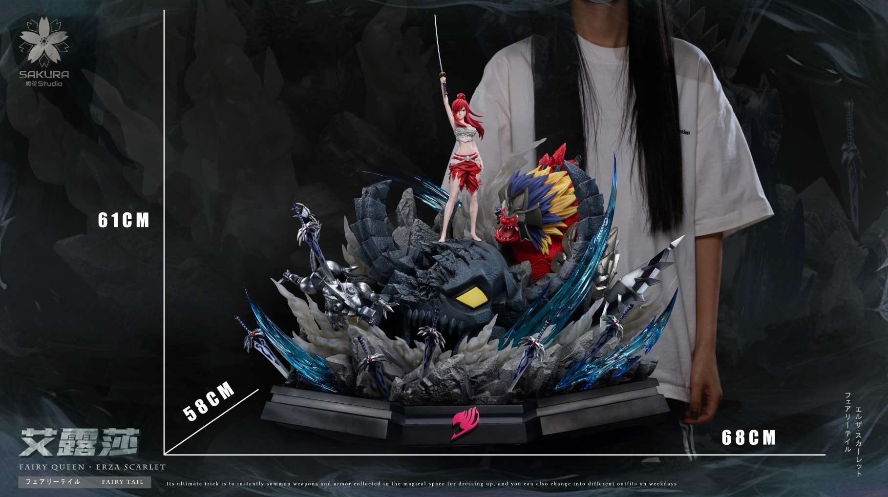 Team: Sakura StudioWork: Fairy Tail 2: Erza ScarletNumber of units: Limited to 100 (10 units reserved for future sale and 1 retained for future sale, 89 units actually sold)Dimensions: Height 61cm Width 68cm Depth 58cmMaterial: imported resin + puOthers: The left eye of Erza's S-level boss has been added with the Purgatory Armor weapon, and the upper right corner of the monster's face will be restored with the anime sticker.Resonance: The next Grey or LucyShipping time: Expected November 2025