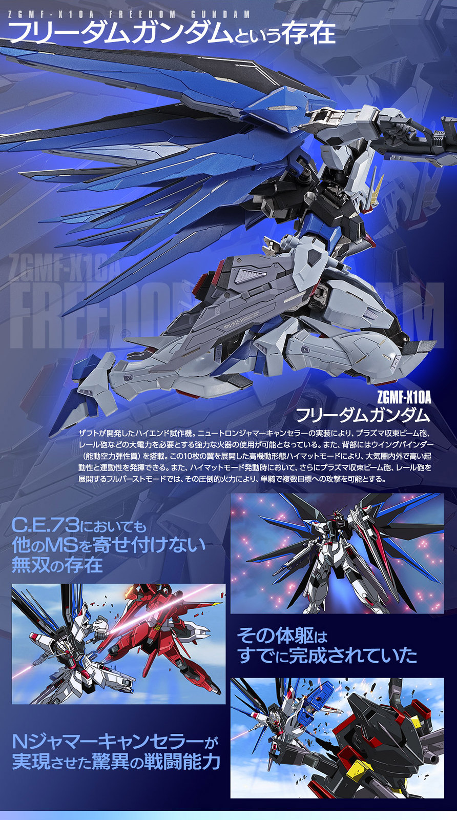 ZGMF-X10A ฟรีกันดั้มเป็น MS รุ่นใหม่ที่ออกแบบโดย ZAFT Army หลังจากจับอาวุธ G ซีรี่ส์ซีรีส์ GAT-X ของสหพันธ์โลกโดยใช้อาวุธลำแสงชุดเกราะเปลี่ยนเฟสและเทคโนโลยีอื่น ๆ เครื่องยนต์ทำงานได้ตามปกติและพลังงานที่เพียงพอไม่เพียง แต่ช่วยเพิ่มเวลาการใช้งานเท่านั้น แต่ยังสามารถเปิดตัวปืน "นาก" ซึ่งเป็นปืนลำแสงพลาสม่า "ปลาวาฬ" ... และอาวุธอื่น ๆ ที่ใช้พลังงานสูงและอาวุธปืนสูง มันมีประสิทธิภาพที่เหนือกว่าในการระเบิดขึ้นสู่ชั้นบรรยากาศและทำการต่อสู้การบินที่คล่องแคล่วสูง หลังจากขับตัวเอก "Huang ? Yato" มันเป็นพลังของตัวเอกในการเล่นตัวปรับที่แข็งแกร่งที่สุด มันไม่ใช่ปัญหาที่จะเปิดการแข่งขันกับ MS จำนวนมากในเวลาเดียวกัน!