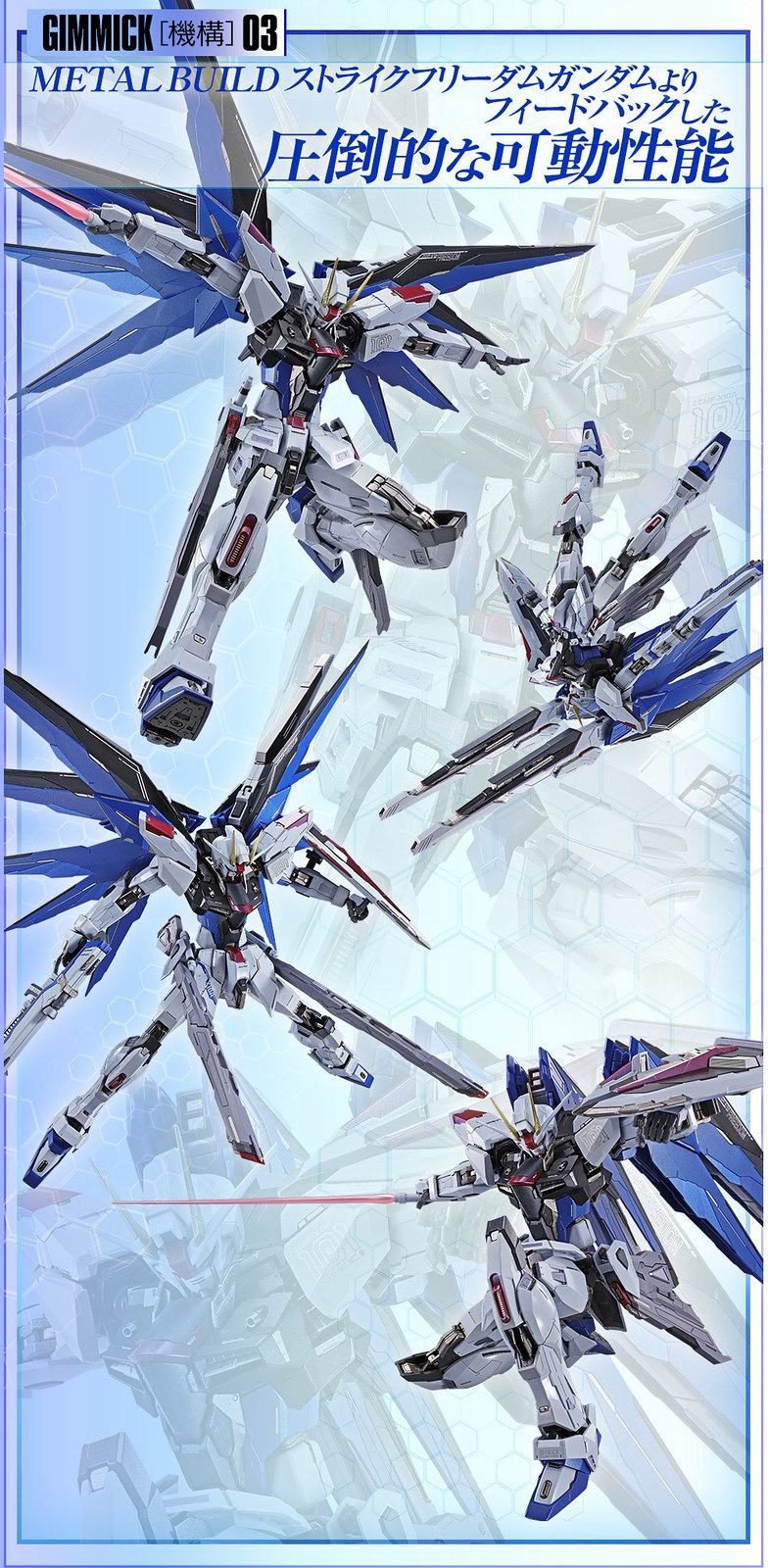 จิตวิญญาณของเครื่องจักรทั้งหมดคือปีกสีน้ำเงินและสีดำที่ด้านหลัง ปีกใหม่ได้รวมเอาคุณสมบัติของ MB ที่ปลอดการโจมตีของกันดั้ม เรียวและปีกที่คม 5 ถูกออกแบบมาทางซ้ายและขวา เพลาโลหะถูกนำมาใช้เพื่อรักษาความแข็งแรงและรูปทรงพัดลมด้านข้าง ขยายตัว สำหรับปืนลำแสงพลาสมาที่มาบรรจบกันของ "วาฬ" ระหว่างปีกมันใช้ฐานที่เคลื่อนที่ได้สามแกนซึ่งทำจากวัสดุโลหะผสม เมื่อหันไปยิงข้างหน้ามันยังสามารถขยายปีกไปทางด้านข้างแสดงภาพที่เร้าใจมากขึ้น เมื่อใช้ร่วมกับปืนลูกซอง "ปลาเซลฟิช" ที่กางออกที่เอวคุณสามารถสร้างทัศนคติ "Single Shot" อันทรงพลัง!