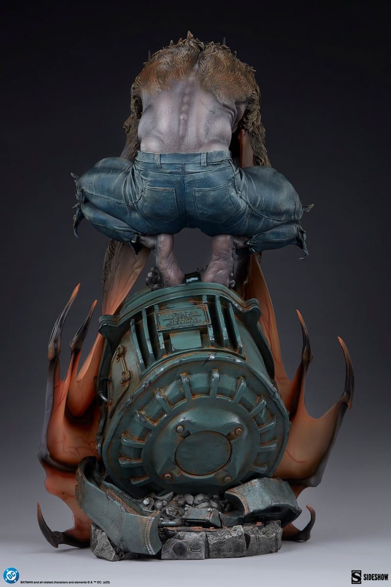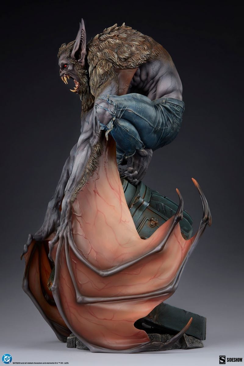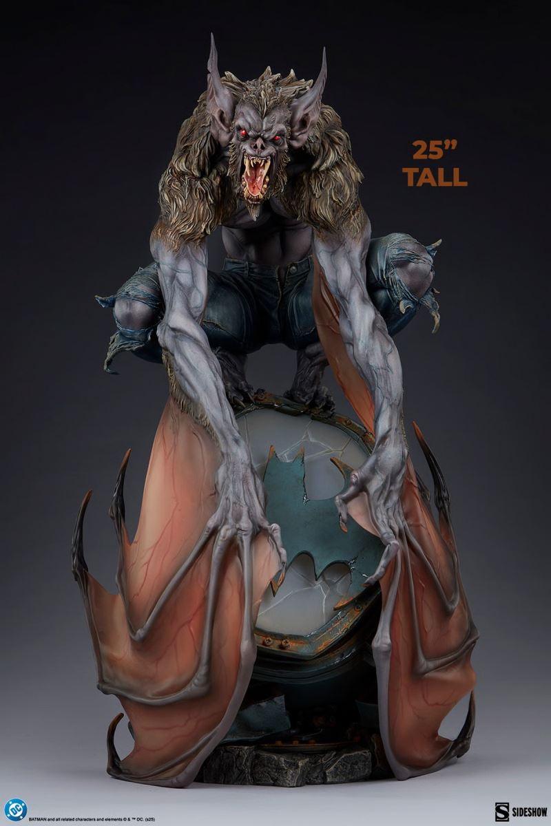 Sideshow presents the Man-BatTM Premium FormatTM Figure, a frightful DC collectible that depicts a rampaging rogue let loose upon the skies of Gotham City.The Man-Bat Premium FormatTM Figure measures 25 inches (63.5 cm) tall, 14.8 inches (36.8 cm) wide, and 13.6 inches (34.6 cm) as this villain perches menacingly on a damaged Bat-Signal. Screeching, the creature beats his sinewy wings against shattered glass and crushed metal. His piercing red eyes have eclipsed all reason and humanity, leaving only a feral thing made of fur, teeth, and fury.This fully sculpted Man-Bat collectible showcases scientist Kirk Langstrom after injecting himself with an experimental serum. Humanoid yet decidedly inhuman, Man-Bat cuts a massive and frightening figure with protruding ears, pointed fangs, and elongated claws. The DC statue’s base features an industrial distress beacon from Gotham PD’s rooftop, engraved with a numerical Easter egg for the most discerning DC fans. Behind Batman’s insignia, the signal also has a light-up feature which can either shine white to call the Dark Knight or bathe the scene in preternatural blood-red — an otherworldly ambiance well-suited to this tragic and terrifying character.Make sense of the strangeness and bring home the Man-Bat Premium FormatTM Figure by Sideshow today!Additional DetailsPurchase LimitsLimit of 2 per person.MaterialsPolystoneProduct SizeHeight: 25 (63 cm)Width: 14.8 (38 cm)Depth: 13.6 (35 cm) ** Size and weight are approx. valuesLearn morePowerLED Power Supply: USB AdapterSKU300915UPC747720276277