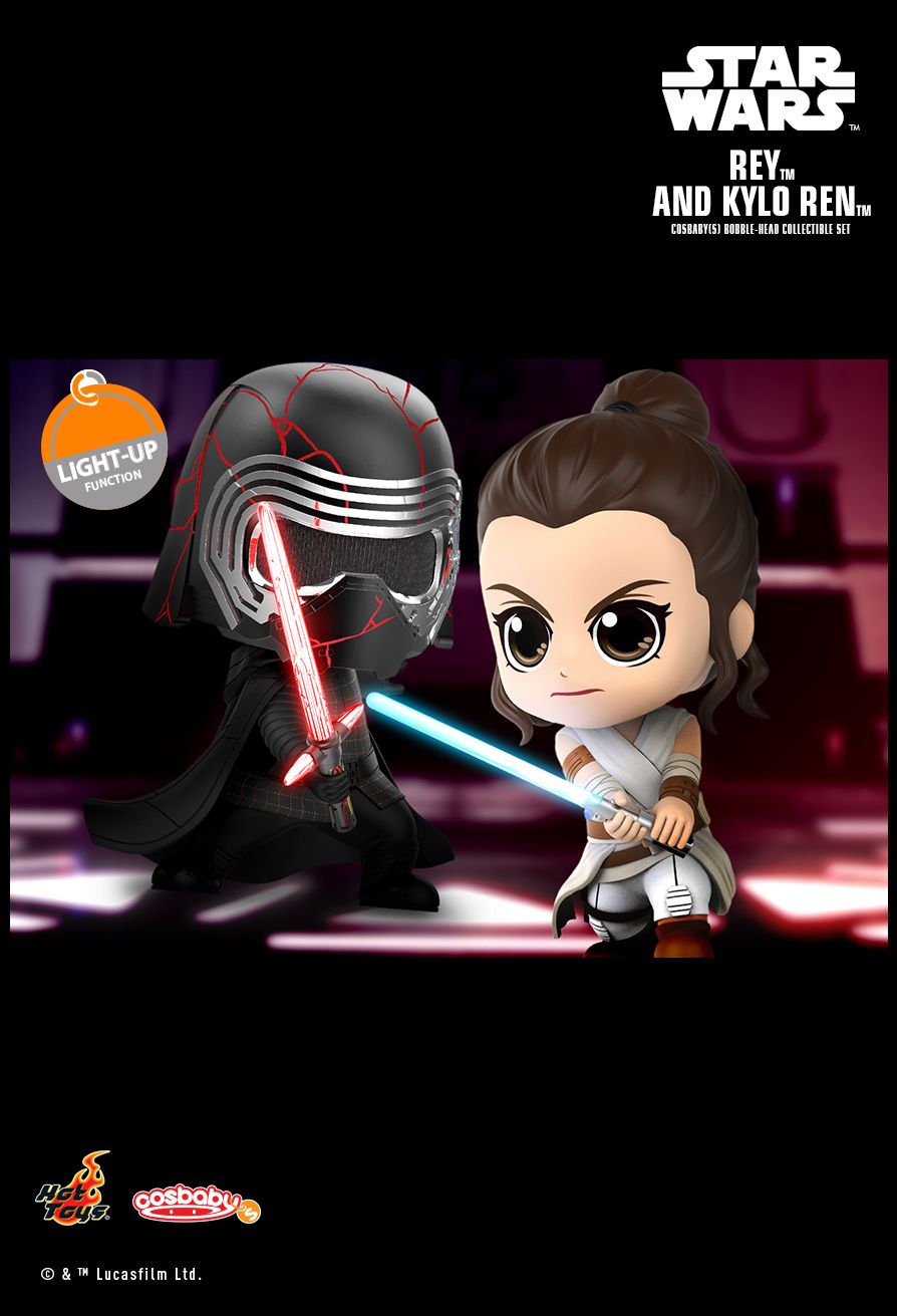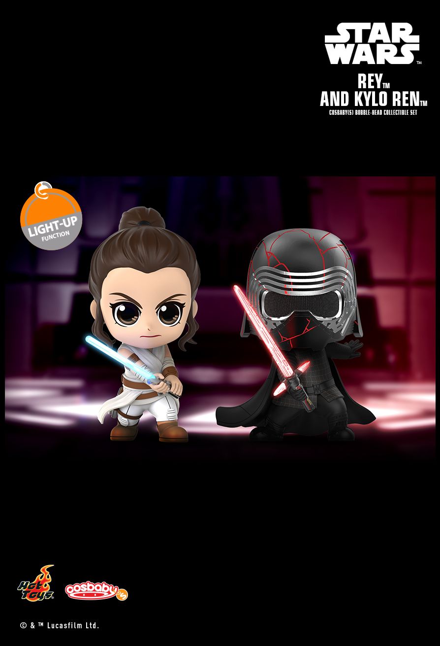 STAR WARS: THE RISE OF SKYWALKERCOSBABYCOSBABY BOBBLE-HEADNo one’s ever really gone…For 42 years after fans first stepped into the galaxy far far away, the Skywalker Saga will come to its grand conclusion in Star Wars: The Rise of Skywalker this upcoming fall! To get fans set up for the final chapter of Star Wars, Hot Toys is excited to reveal a brand new series of Cosbaby collectibles prior to theatrical release. Featuring Rey and Kylo Ren Cosbaby (S) collectible set with LED light up function; Sith Trooper, and C-3PO Cosbaby (S) Bobble-Head with each stands approximately 11 cm tall including figure base.The lightsaber battle between Rey and Kylo Ren continues in the amazing collectible set! Rey dressed in white Jedi outfit wielding her LED lighted blue lightsaber and helmeted Kylo Ren in matte black robe costume carrying his LED lighted red crossguard lightsaber, are going to choose their sides and awaken the Force within.The elite red-armored Sith Trooper appears as part of the First Order’s army has arrived for duty, whereas the famous gold colored droid C-3PO appears to be fairly busy holding on to Rey’s staff and bag as well as Chewie’s bowcaster and bandolier bag.Take part in the epic Star Wars battle with the latest Hot Toys Cosbaby!SPECIFICATIONSPRODUCT CODECOSB688 - COSB690PRODUCT NAMECOSBABYHEIGHTAPPROXIMATELY 11 CM TALL WITH BASEPOINTS OF ARTICULATIONS0SPECIAL FEATURESSTAR WARS: THE RISE OF SKYWALKER CHARACTERS IN STYLIZED COSBABY FORMARTISTSHEAD SCULPTED BY N/A.HEAD PAINTED BY N/A.HEAD ART DIRECTED BY N/A.Special Features:- Star Wars: The Rise of Skywalker characters in stylized Cosbaby form- Approximately 11 cm tall with base- “Rey and Kylo Ren Cosbaby (S) Bobble-Head Collectible Set” contains LED light-up lightsabers (battery operated)- Non-articulated figure with bobble-headRelease date: Approximately Q4, 2019 – Q1, 2020**Prototype shown, final product may be slightly different**Battery included; button cells are required**Product details can subject to change without further notice© & TM Lucasfilm Ltd.© 2019 Hot Toys Limited. All Rights Reserved.