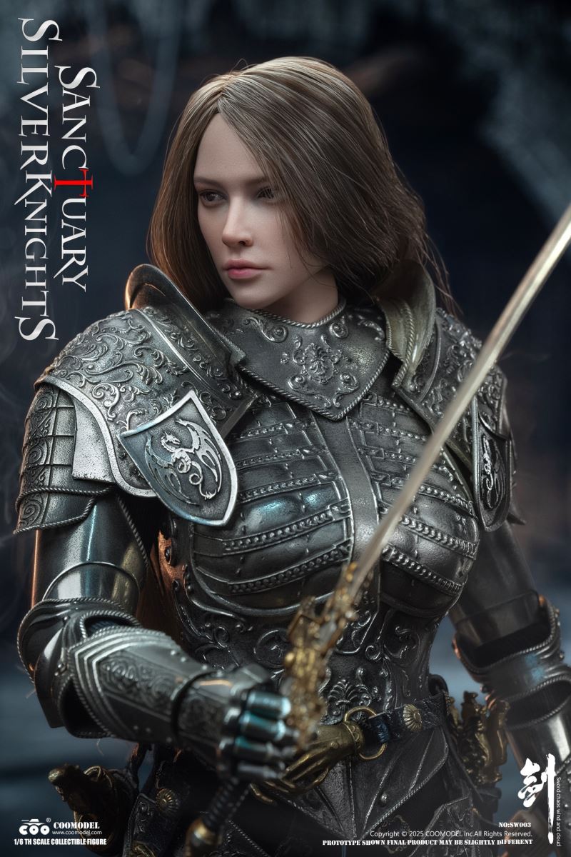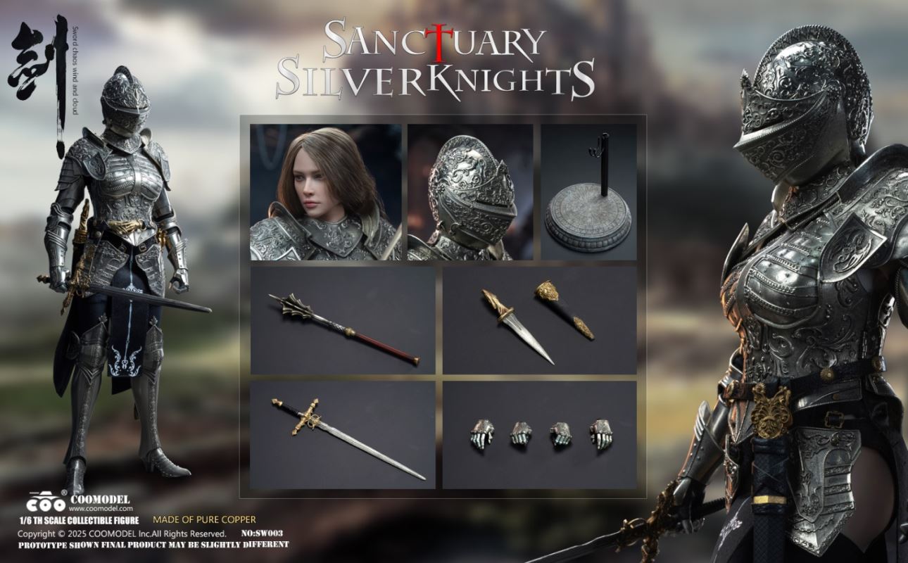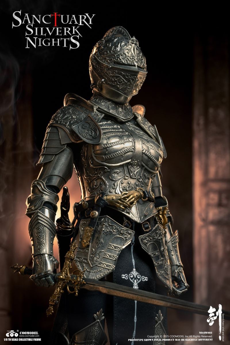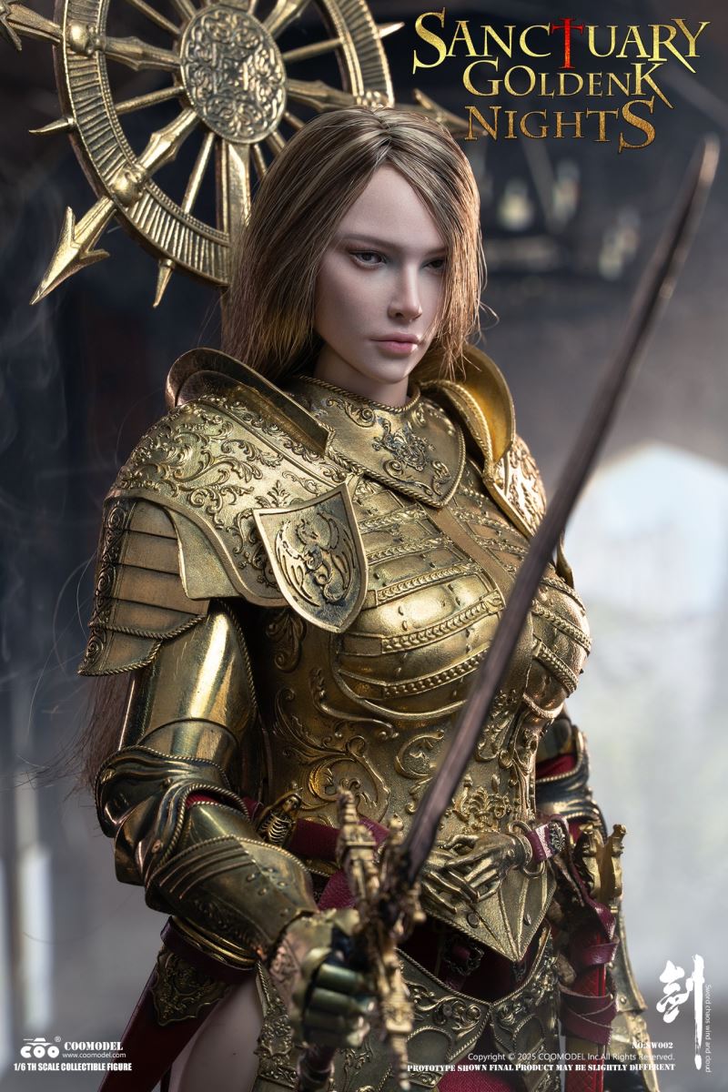 COOMODEL 1/6 NO.SW002 SWORDS OF CHAOS - GOLDEN TEMPLE GUARDIAN (BRASS EDITION)Barcode:6971242122437The suit of armor is 100% made of copper materialsThe 1/6th Scale Golden Temple Guardian Collectible Figure Specially Features:- One (1) rooted hair head sculpt of a Female Guardian with articulated eyes- One (1) highly articulated female body- Four (4) pieces of interchangeable armored handsCostumes:- One (1) fully enclosed gold engraved helmet with angel ornament on top- One (1) gold engraved halo back accessory- One (1) pair of gold engraved shoulder armors- One (1) gold engraved chest and back armor- One (1) pair of gold engraved arm armors- One (1) gold engraved hanging skirt armor- One (1) pair of gold engraved leg armors- One (1) pair of gold engraved battle boots- One (1) red embroidered high-slit one-piece inner dress- One (1) pair of red thigh-high socks- One (1) leather waist belt with gold hand-shaped buckleWeapons:- One (1) gold engraved cross longsword with scabbard- One (1) gold engraved dagger with sheath- One (1) flailAccessories:- One (1) red brick-style round base stand--------------------------COOMODEL 1/6 NO.SW003 SWORDS OF CHAOS - SILVER TEMPLE GUARDIAN (NICKEL SILVER EDITION)Barcode:6971242122444The suit of armor is 100% made of copper materialsThe 1/6th Scale Silver Temple Guardian Collectible Figure Specially Features:- One (1) rooted hair head sculpt of a Female Guardian with articulated eyes- One (1) highly articulated female body- Four (4) pieces of interchangeable armored handsCostumes:- One (1) fully enclosed silver engraved helmet- One (1) pair of silver engraved shoulder armors- One (1) silver engraved chest and back armor- One (1) pair of silver engraved arm armors- One (1) silver engraved hanging skirt armor- One (1) pair of silver engraved leg armors- One (1) pair of silver engraved battle boots- One (1) black embroidered high-slit one-piece inner dress- One (1) pair of black thigh-high socks- One (1) leather waist belt with gold hand-shaped buckleWeapons:- One (1) gold engraved cross longsword with scabbard- One (1) gold engraved dagger with sheath- One (1) pole hammerAccessories:- One (1) gray brick-style round base stand