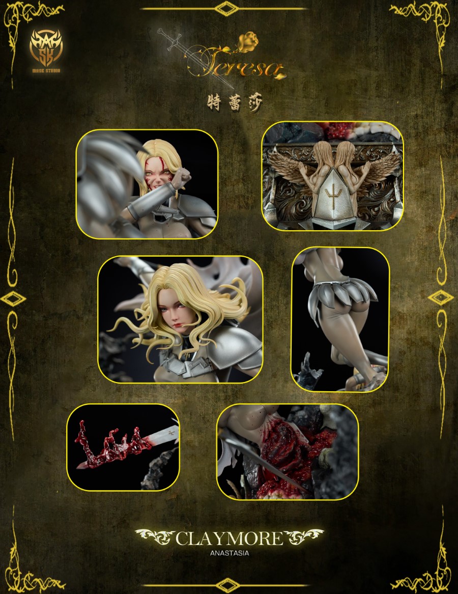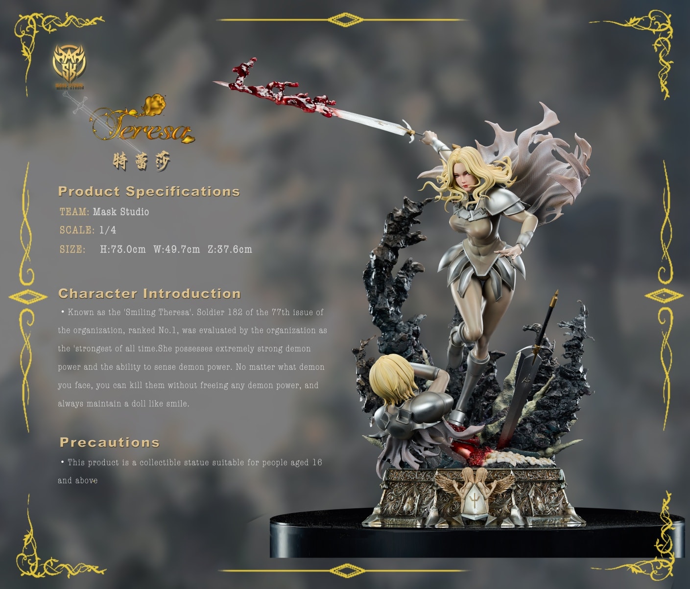 Brand:Mask StudioProduct name:Claymore TeresaES:99(each scale)Scale:1:6/1:4Size 1:6:H48.6 W33 D25CMSize 1:4:H73 W49.7 D37.6CMMaterials:PU+Resin+PolystoneEstimated release time:Q3 2026Est. Completion:2026 Q1-Q2Size:(H) 73 cm x (D) 37.6 cm x (W) 49.7 cmLimited No Of Unit:99Product IP:ClaymoreProduct Role:TeresaProduct Features:Other animationsProduct Scale:1/4Height Range:70-90cm