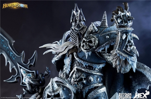 “Warriors of the frozen wastes, rise!”Sideshow, HEX Collectibles, and Blizzard Entertainment are proud to present The Lich King 1:10 scale statue from the digital strategy card game Hearthstone®. The Lich King is a legendary neutral minion from the Knights of the Frozen Throne set. This statue faithfully recreates the Lich King Arthas based on his card art, showcasing stunning details in 1:10 scale. As the master and lord of the Scourge, he wears intricate steel-like armor and the Helm of Domination, commanding his undead army from the Frozen Throne atop Icecrown Citadel. Arthas stands on a base of icy rocks and snow, wielding Frostmourne in his right hand while raising his left fist to intimidate his enemies. His sculpted flowing hair and menacing face under the helmet bring the Lich King to life.The base also features a transparent icicle and cloud diorama, along with a dragon emerging from the ice, inspired by the dragon around his card portrait. Elements of his card, such as Attack value, Health value and Rarity, are also displayed in front of the base. The pedestal mimics the rectangular shape of cards with realistic textures and cracks, adding an epic touch to the whole statue.Just like the brand concept of HEX Collectibles, the team has always looked at ways to push the boundary on design and capture the essence of each character they love. HEX Collectibles will continue to bring beloved characters to life with the distinguished dynamic design style.Hearthstone fans, don't miss your chance to add this Lich King statue to your Warcraft collection! Size : 1/10 (H:30.1cm W:25.5cm D:20.5cm)MaterialsPolystone , PUProduct SizeHeight: 11.9 (30 cm)Width: 10 (25 cm)Depth: 8.1 (21 cm) *Release : Q4/2024