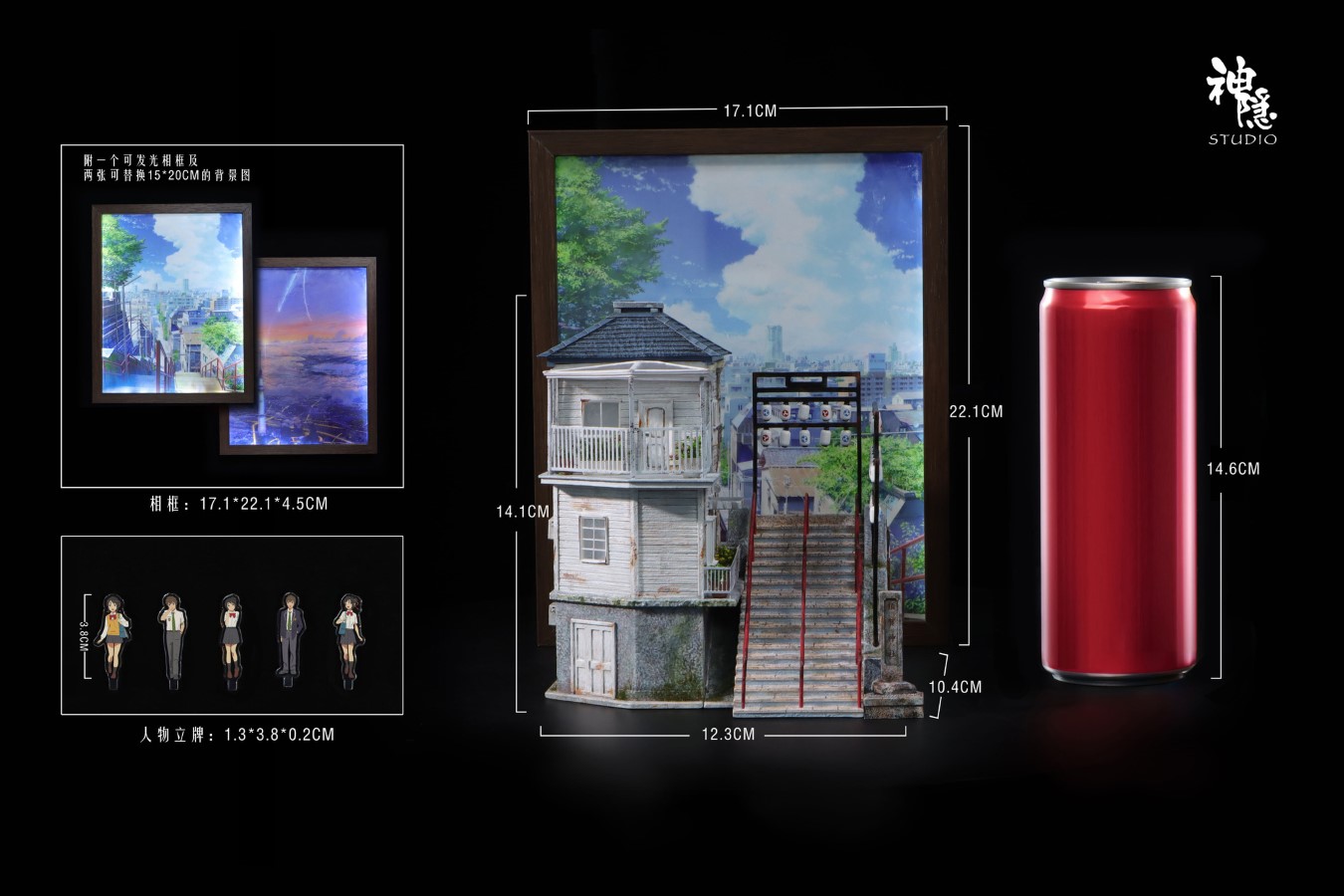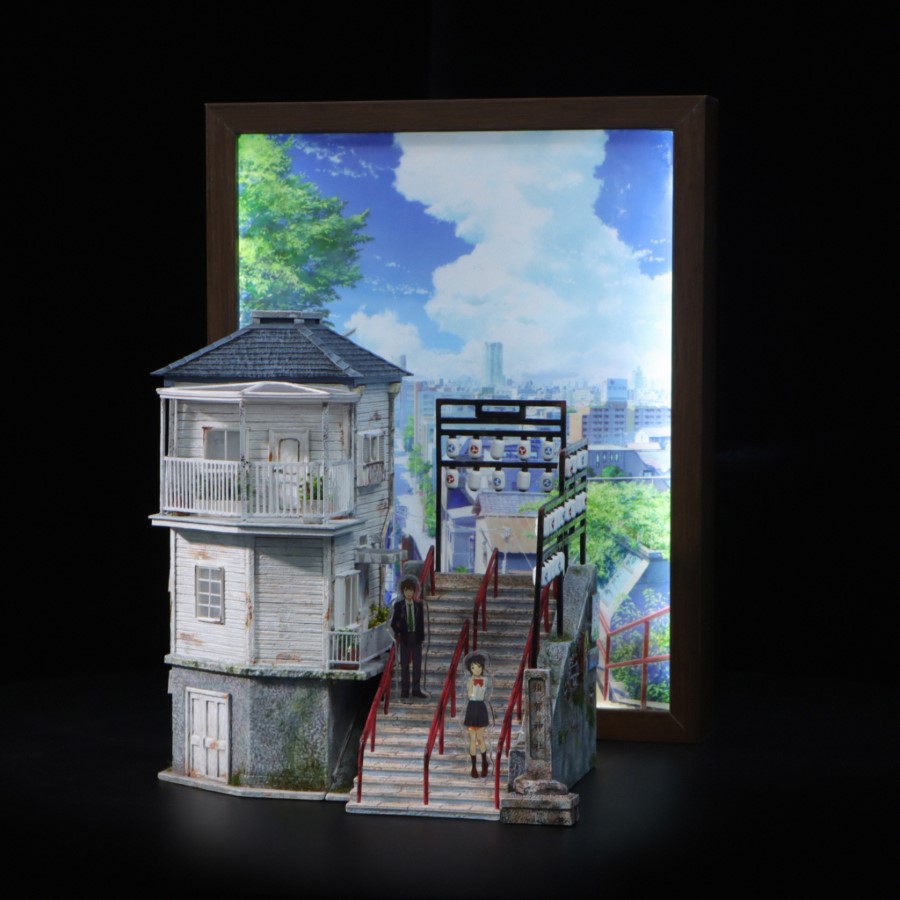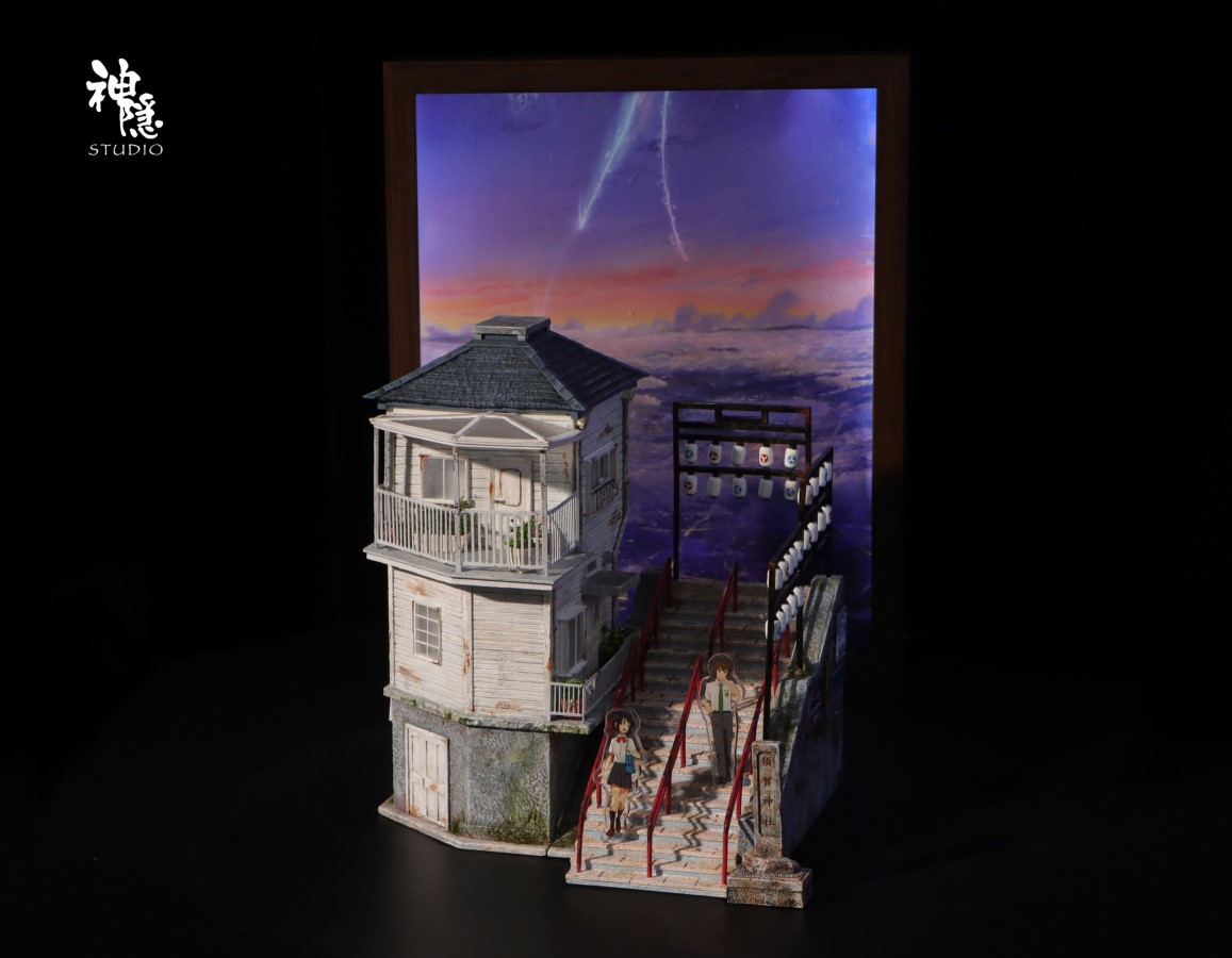 Brand:ShenYin StudioProduct name:Your Name SceneIS:200Scale:1:6Size acrylic board:H3.8 W1.3 D0.2CMSize scene:H14.1 W12.3 D10.4CMSize photo frame:H22.1 W17.1 D4.5CMEstimated release time:Q4 2025*Configuration: base+Tachibana Taki acrylic board*2+Miyamizu Mitsuh acrylic board*3+luminous photo frame+replaceable background board*2Feature:House with LED(modes: Light up layer by layer, constant light, breathing light)Photo frame with LED(constant light and adjustable in brightness)The luminous photo frame is equipped with a built-in speaker and can play the following songs: Sparkle (movie ver.), Zenzenzense (movie ver.), Nandemonaiya (movie ver.)