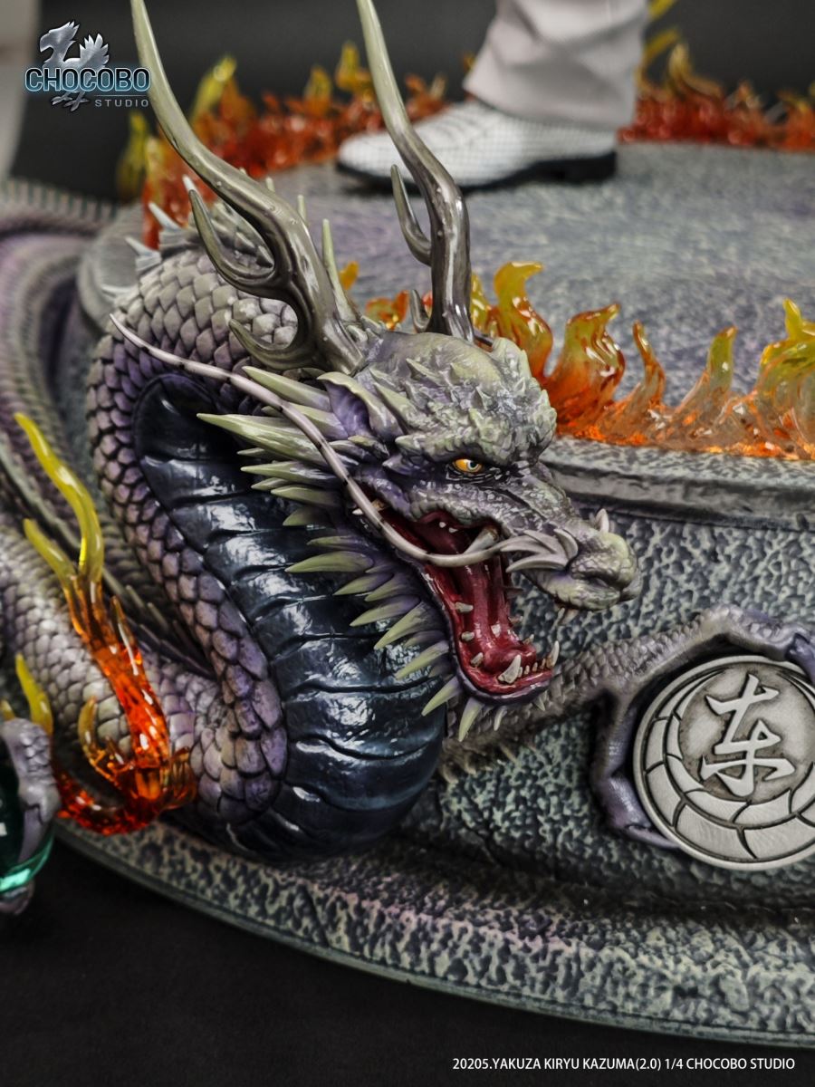 Studio: CHOCOBO StudioProduct Name:Kazuma Kiryu 2.0Size: (H) 53 cm x (D) 41 cm x (W) 39 cmLimited No Of Unit: 120 in totalProduct IP: YakuzaProduct Role: Kazuma KiryuProduct Features: Other gamesProduct Scale: 1/4Height Range: 51-70cmProduct Material: Imported resin + PUConfiguration:Standard Version: Suit version (excluding tattoo replacement half body and red shirt replacement half body) character body + 1 head sculpture + Yinglong platform + special effects + commemorative coinsDeluxe Version: character body + 3 replacement half bodies (suit + red shirt + tattoo half body)