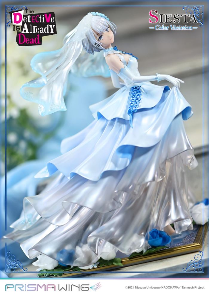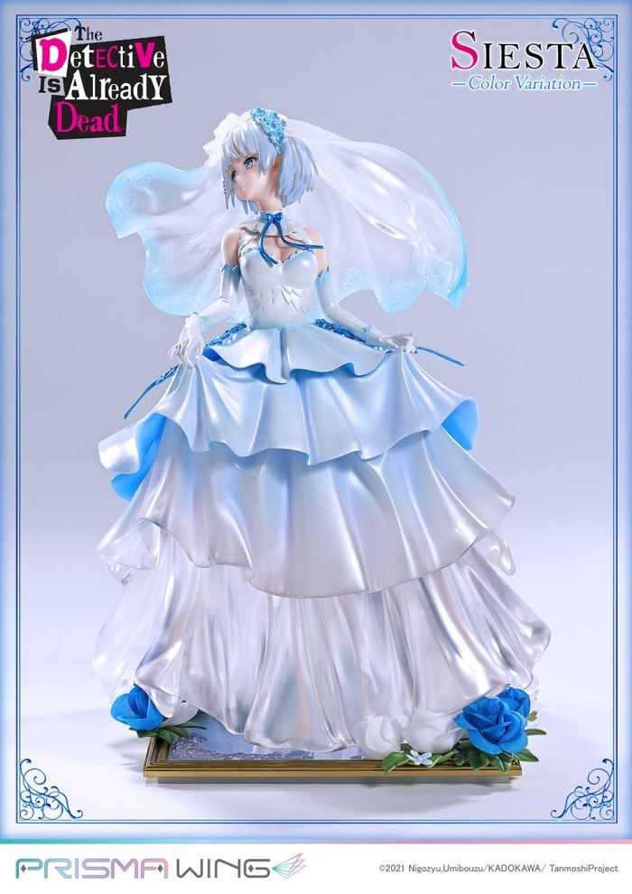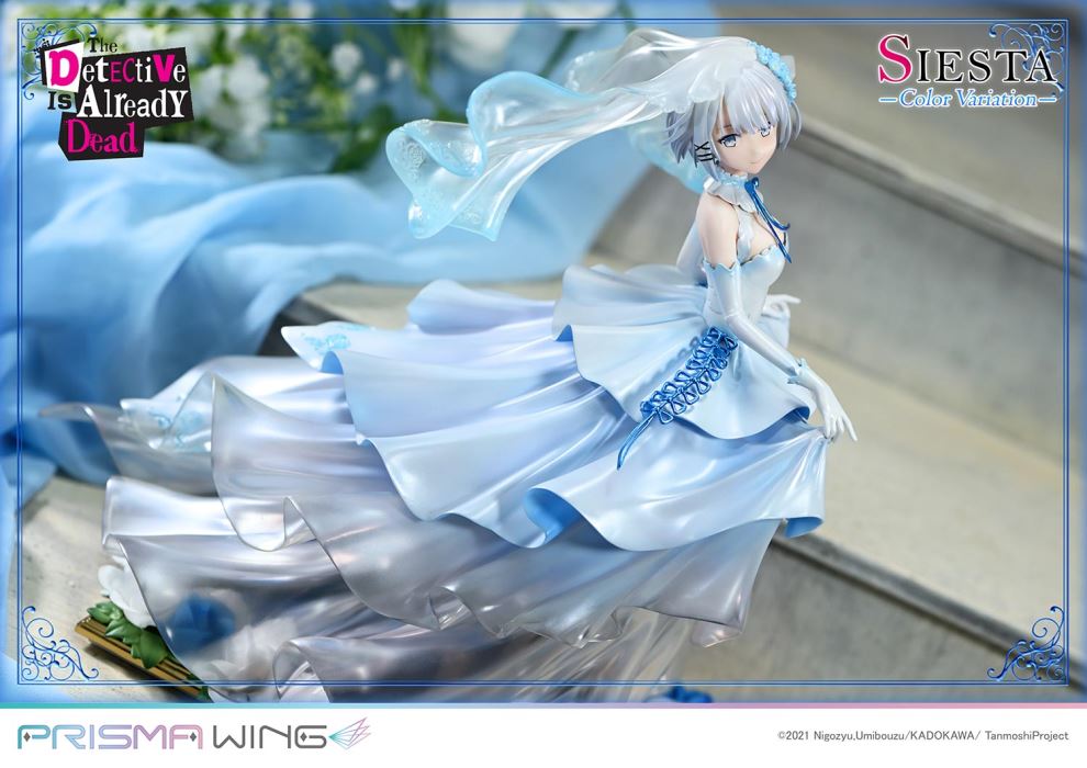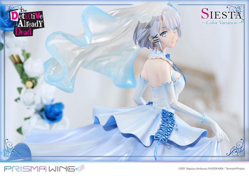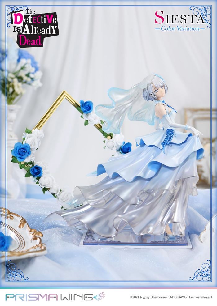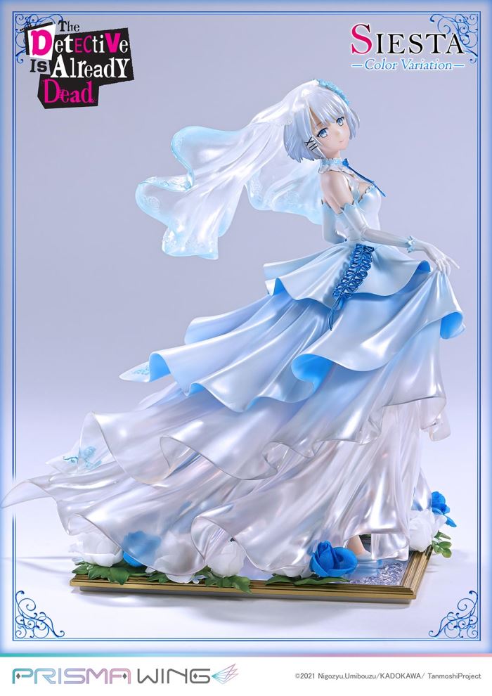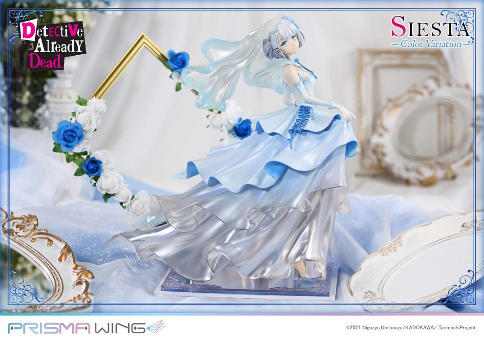 Beauty in color, elegance in form, and perfection in every detail. From the TV anime The Detective Is Already Dead, a stunning new color variant of Siesta in her elegant wedding attire makes her appearance.Now dressed in a serene blue reminiscent of clear skies and the open sea, the beloved detective takes on a refreshing new charm. Her embroidered veil adorned with roses, the gently fluttering ribbons, and the gracefully flowing skirt are all painted in a delicate range of hues. Combined with pure white, they evoke an image of refined grace and quiet intelligence.This version brings forth an entirely new side to one of Siesta’s most iconic outfits. Accentuating her elegance is a special photo frame-style base blooming with a blue rose. Display it standing tall or resting softly at the base—enjoy multiple arrangements to suit your style.In addition, this bonus edition includes a postcard featuring Siesta, beautifully printed in high quality. A special collectible you won't find anywhere else.With a gentle smile like an angel’s, Siesta stands framed in timeless beauty. We bring you her everlasting charm, now touched with a fresh new hue.Specifications:Special Photo Frame-Style BasePostcard [BONUS PART]Notice:Prototype samples shown.Product details could be subject to change without further notice.Please note the final product specifications may differ because each product is Handmade.Since the product is still in the development stage, the Size (up to 10%) & Weight (up to 10kg) may be changed during the production stage.©2021 Nigozyu,Umibouzu/KADOKAWA/ TanmoshiProjectDETAILSBrandsPRISMA WINGCollectionPRISMA WING CollectionSeriesThe Detective Is Already DeadScale1/7 ScaleProduct CodePWTMS-02PSProduct Size Approx.H:23cm W:23cm D:17cmCarton(Est):1 boxCarton Size Approx.Carton A [ H 28.5cm × W 21.5cm × D 31.1cm ]MaterialsPVC/ABS and other materialsJAN4582647121790