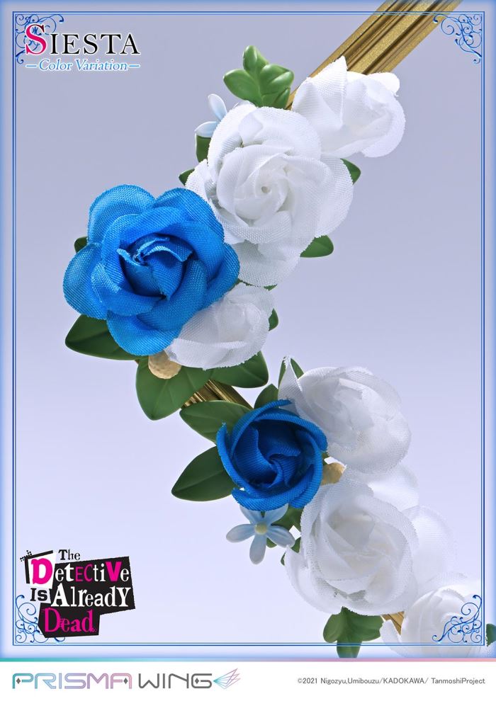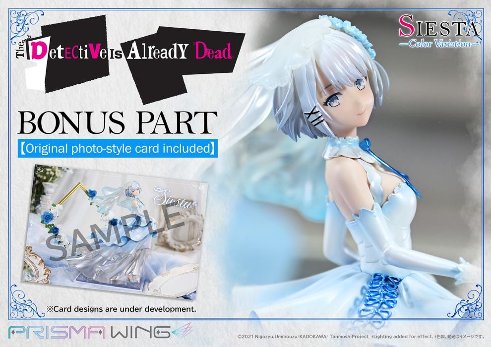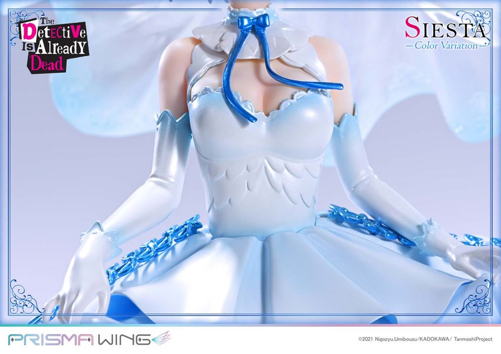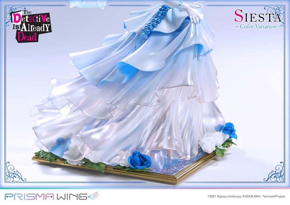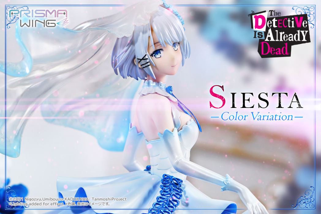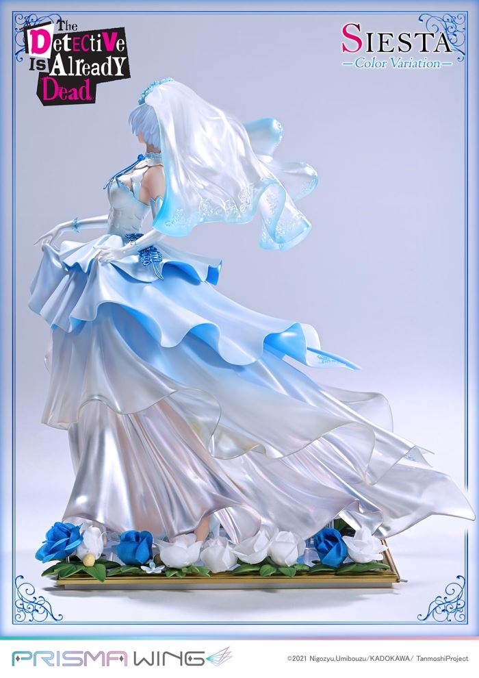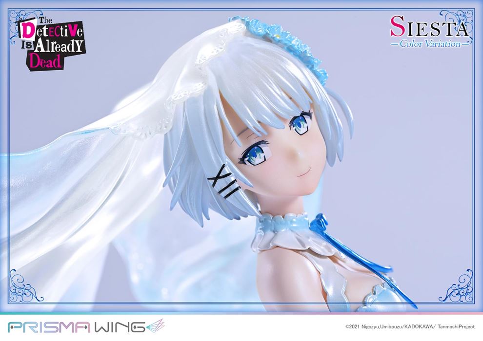 Beauty in color, elegance in form, and perfection in every detail. From the TV anime The Detective Is Already Dead, a stunning new color variant of Siesta in her elegant wedding attire makes her appearance.Now dressed in a serene blue reminiscent of clear skies and the open sea, the beloved detective takes on a refreshing new charm. Her embroidered veil adorned with roses, the gently fluttering ribbons, and the gracefully flowing skirt are all painted in a delicate range of hues. Combined with pure white, they evoke an image of refined grace and quiet intelligence.This version brings forth an entirely new side to one of Siesta’s most iconic outfits. Accentuating her elegance is a special photo frame-style base blooming with a blue rose. Display it standing tall or resting softly at the base—enjoy multiple arrangements to suit your style.In addition, this bonus edition includes a postcard featuring Siesta, beautifully printed in high quality. A special collectible you won't find anywhere else.With a gentle smile like an angel’s, Siesta stands framed in timeless beauty. We bring you her everlasting charm, now touched with a fresh new hue.Specifications:Special Photo Frame-Style BasePostcard [BONUS PART]Notice:Prototype samples shown.Product details could be subject to change without further notice.Please note the final product specifications may differ because each product is Handmade.Since the product is still in the development stage, the Size (up to 10%) & Weight (up to 10kg) may be changed during the production stage.©2021 Nigozyu,Umibouzu/KADOKAWA/ TanmoshiProjectDETAILSBrandsPRISMA WINGCollectionPRISMA WING CollectionSeriesThe Detective Is Already DeadScale1/7 ScaleProduct CodePWTMS-02PSProduct Size Approx.H:23cm W:23cm D:17cmCarton(Est):1 boxCarton Size Approx.Carton A [ H 28.5cm × W 21.5cm × D 31.1cm ]MaterialsPVC/ABS and other materialsJAN4582647121790