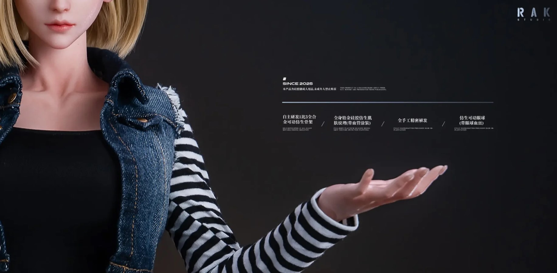 Brand: RakProduct: Superstar Series (First Model) Dragon Ball Android 18Size: 1/3 Approximately 75cm tallLimited quantity : 199Material: SiliconeIncludes: Solid wood two-tone base + four bonus costumes + adjustable metal support rod + doll accessories kitNote: Pre-orders will receive a free mysterious denim cosplay costume1.) The studio spent 385 days independently developing the Shen Ji 1.0 movable bionic alloy skeleton2.) The hair is fully hand-planted with meticulous detail3.) The eyes are movable bionic with blood vessels4.) The head sculpt is made of high-grade platinum silicone with bionic skin textureExpected Shipping Date: Q4 2025 - Q4 2026