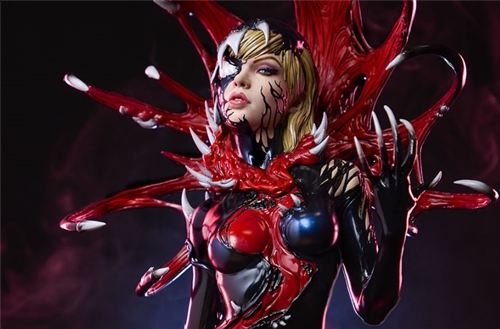 “Okay, boys ... we try it your way ... we speak your language...”Sideshow presents the Gwenom Premium Format™ Figure, a captivating Marvel collectible showcasing Ghost-Spider’s calamitous convergence with the Venom symbiote.It’s a takeover ... and a makeover! The Gwenom Premium Format™ Figure measures 22 inches (55.8 cm) tall, 10.5 inches (26.2 cm) wide, and 8 inches (20.3 cm) deep, striking a stunning juxtaposition between Gwen Stacy’s violence and vulnerability. She is corrupted yet empowered as the liquified symbiote merges with her feelings — and fashion sense. Her hood bears salivating fangs like an oversized Venus flytrap, while the slimy symbiote creates a bodysuit and heels for its host. Gwenom’s entire sense of self has been warped and distorted through a venomized lens, and she can be seen smirking even as an alien anger consumes her.Based on Inhyuk Lee’s variant cover for King in Black: Gwenom vs. Carnage #1 (2021), the fully sculpted Gwenom Premium Format™ Figure features a vicious antihero engulfing an Earth-65 icon. She raises one clawed hand while Venom’s tooth-studded tongue trails down her body toward more inky tendrils below. Gwen stands on a stone-textured base that has also been overrun with symbiotes, emphasizing the inescapable nature of her predicament. Pair this Marvel statue with the Gwenom vs. Carnage Fine Art Print by Inhyuk Lee — sold separately — for the ultimate tribute to this Queen in Black.It's time to embrace your darkness! Bring home the Gwenom Premium Format™ Figure by Sideshow today.MaterialsPolystoneProduct SizeHeight: 22 (56 cm)Width: 10.5 (27 cm)Depth: 8 (20 cm) *