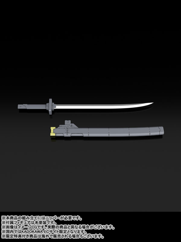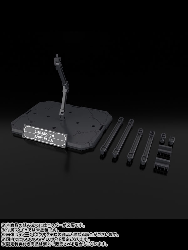 SpecificationsAssembly Type Plastic ModelScale: 1/48Size: Approx. H180mm, Base: Approx. W160 x D120 x H10mm[Set Contents]Plastic Model Set[Limited Edition Purchase Bonus]Type 10 Modified Monomolecular Blade Plated Ver.Special Display Base Designed by Kanetake Ebikawa x1 setSpecial Sleeve Packaging[Bonus]Boxer II 76mm Shot Cannon x1Boxer II 76mm Shot Cannon Magazines x2DetailsPlanning Cooperation:Fantasia Bunko Editorial DepartmentPlanning: DENGEKI HOBBY WEBProduction: KADOKAWA PLASTIC MODEL SERIESThe new AS (Arm Slave) Azure Raven from the Fantasia Bunko series Full Metal Panic! Family joins the KADOKAWA PLASTIC MODEL SERIES!-Thanks to the supervision of mechanical designer Kanetake Ebikawa, parts made with colorful materials, and pre-painted parts, a realistic AS can be created by simplyassembling the model.-The movable mechanisms that were specially designed for this model enable the recreation of iconic poses, including unsheathing and firing poses.-The mechanical details have been condensed into an approximately 180 mm-tall body.-The two types of standard hardpoints enable you to attach the weapons to places of your choice.-A wide variety of weapon parts are included, such as the Type 10 Modified Monomolecular Blade and the Boxer II 76mm Shot Cannon.-Clenched fists, open, open (relaxed), sword-gripping, and firearm-gripping hand parts are included.Type 10 Modified Monomolecular Blade Plated Ver.-A gorgeous Type 10 Modified Monomolecular Blade with a silver-plated blade and a gold-plated koiguchi sheath is included.Special Display Base Designed by Kanetake Ebikawa-A special display base designed by Kanetake Ebikawa is included.-This is a special edition item with intricate designs on the base itself and even the support pillar.-A nameplate to further enhance displays is also included.(Display base size: Approx. W160 xD120 xH10 mm)Special Sleeve PackagingA special sleeve that can store both the main package and the limited edition bonus package is included.The sleeve features an original illustration by illustrator Naochika Morishita.*Nippers are required to assemble this product.*The included figures are unpainted.Product Contents-Main model x1-Hand parts x5 types-Type 10 Modified Monomolecular Blade x1-Boxer II 76mm Shot Cannon x1-Boxer II 76mm Shot Cannon Magazines x2-Sousuke Sagara (Casual clothes) Figure x1-Natsumi Sagara (Summer uniform) Figure x1-Type 10 Modified Monomolecular Blade Plated Ver. x1-Special Display Base Designed by Kanetake Ebikawa x1 set-Special Sleeve Package*Bonus:-Boxer II 76mm Shot Cannon x1-Boxer II 76mm Shot Cannon Magazines x2CopyrightShouji Gatou, Shikidouji, Kanetake Ebikawa
