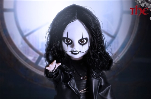 The Crow Living Dead Doll สวมใบหน้าที่เป็นเอกลักษณ์ของเขาและสวมใส่เสื้อเชิ้ตสีดำกางเกงหนังดูและเสื้อคลุมหนังดู Erik Draven สวมแหวนหมั้นของคู่หมั้นของเขารอบคอของเขาในความทรงจำของเธอ