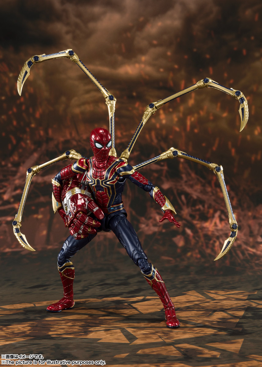 ใน S.H.Figuarts Bandai Spirits แนะนำเราให้กับ Iron Spider ที่สร้างขึ้นใหม่อย่างสมบูรณ์แบบด้วยเทคนิคการวาดภาพ 3 มิติพิเศษของ บริษัท Tamashii Nations พื้นผิวของภาพเป็นสิ่งที่น่าแปลกใจอย่างแท้จริงและอุปกรณ์เสริมที่ทาง บริษัท รวมไว้นั้นสมบูรณ์แบบ Tamashii Nations รวมเราไว้เป็นอุปกรณ์เสริม: หัวเปลี่ยนได้สองอัน (ของ Iron-Spider และของ Peter Parker), ดวงตาคู่เปลี่ยนได้สี่คู่, มือเปลี่ยนได้ห้าคู่, ชิ้นส่วนของใยแมงมุมสำหรับข้อมือซ้ายและขวา, ส่วนต่าง ๆ ของเอฟเฟกต์ ของใยแมงมุม, ชุดที่มีขาแมงมุม, ถุงมือนาโนและชุดของชิ้นส่วนเพื่อให้เราสามารถเข้าร่วมร่างนี้กับเวที Tamashii ที่ Bandai Spirits จำหน่ายแยกต่างหาก