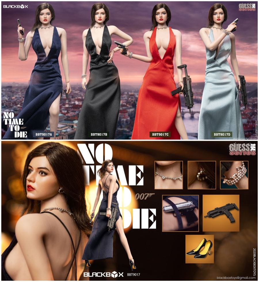 Black Box Toys BLACKBOXTOYS 1/6 007Die Another Day -Girl BLACKBOXTOYS 1/6 007 NO TIME TO DIE GIRLPRODUCT ITEM NO.:1. BBT9017A2. BBT9017B3. BBT9017C4. BBT9017Dproduct does not contain body , It is recommended to match with TBLeague S19B wheat color medium breast bodyNOT INCLUDED WITH BODY, TBLeague S19B Body's been used for photographyaccessories include:SET INCLUDES:clothing COSTUME:1 X silk dress (4 colors optional) SILK DRESS (4 COLOURS)& #61548; Royal Blue ROYAL BLUE ---A Style Black BLACK---B Style Red RED---C Style Silver SILVER---D StyleSimulation Head Sculpture REALISTIC HEAD -SCULPT PalomaACCESSORIES: Necklace Bracelet X 1PCS Earrings X 1PAIR 61548 ; Bracelet X 1PCSWEAPON:PPK Pistol PPK PISTOL X1MP7 Machine Gun MP7 MACHINE GUN X1