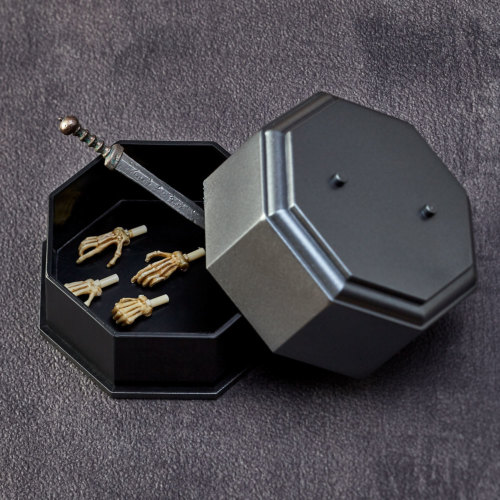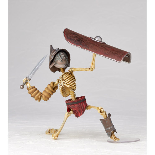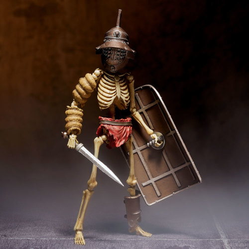 นอกจากอุปกรณ์พื้นฐานแล้วยังมีกลาดิอุสดาบยาวโปรยลงมาและโล่ขนาดใหญ่ (Scutum) รวมอยู่ด้วย อุปกรณ์แต่ละชิ้นแสดงออกถึงรอยขีดข่วนและรอยบุบของอุปกรณ์ที่ใช้แล้วซึ่งตรงกับลักษณะของโครงกระดูกและพื้นผิวโลหะที่จางลงและเปล่งประกายหม่น นอกจากนี้ยังรวมฐานที่ช่วยให้คุณยืนได้อย่างมั่นคงในขณะที่โพสท่าด้วย