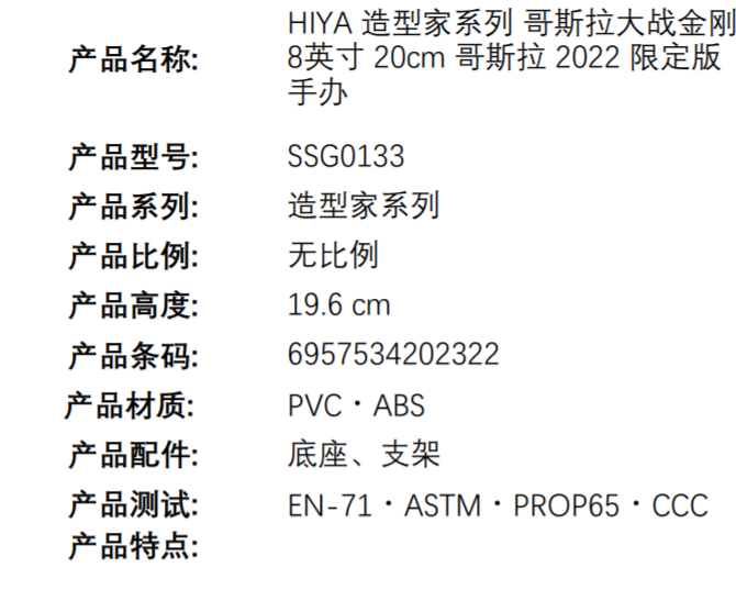 HIYA stylist series Godzilla vs. King Kong 8 inches 20cm Godzilla 2022 limited edition figureAtomic breath is ready, the outcome is in an instant! The angry God of Destruction Godzilla reproduces the Haiya toy [STYLIST] series.The American sci-fi monster movie #Godzilla vs. King Kong released in 2021 is the fourth work in the legendary monster universe series. Godzilla and King Kong, twopowerful opponents like gods, will start the battle of the century in Hong Kong.The plot follows the Skull Island incident for more than 50 years. There is only one aboriginal on the island, Gia. She has a unique and strong connection with King Kong. In order to protect King Kong's safety, King Kongand his protector embark on a journey to find their true home. On the other hand, Madison, the daughter of Dr. Emma Russell, is also trying to find the truth behind Godzilla's out-of-control with her friends, and unexpectedly discovers that she is actively and secretly researching an unknown large-scale device. . . .The height of Godzilla's body is about 196mm. Referring to the original CG data of the movie, the thick neck and armor-like skin have been delicately restored; this product ismade and applied with multi-layer coating, which perfectly reproduces the Godzilla in the play. Pull the scene of using atomic breath; in addition, the effect of atomic energy gathering in Godzilla's back scale can be more faithfully reproduced by illuminating the back with light, making this product more ornamental!
