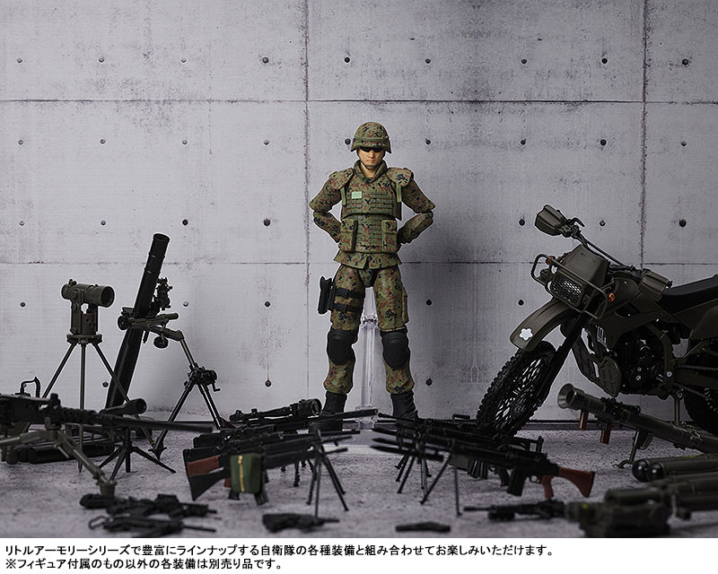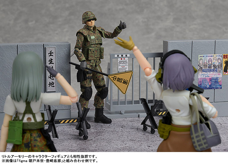 Pre-painted Posable FigureSize: Approx. H160mm (non-scale)Material: Plastic[Set Contents]Main figureBaseLittleArmory Type 89 plastic model kit (made of PS)Sculptor: DragoncraftCooperation: Max FactoryRealistic military action figures are coming to the figma series!From the 1/2 scale model weapon series Little Armory comes new realisitic military figma action figures!The first in the series is Japan's Self-Defense Force. The figma is based on the Ground Self-Defense Force Infantry of the 2000s.-Pad printing is used to create the unique camouflage pattern of the Japan Ground Self-Defense Force. The printing pad is applied over 200 times to create the uniform.-With the aim of capturing the appeal of a single nameless soldier, the face plate of the figure is made with sunglasses.-The neck features articulation in two spots, allowing you to display the figure holding its included rifle in an even more realistic way.-By creating kneepads as separate parts and adding double-joint articulation to the knees and shoulders, it is possible to create all kinds of military poses.-Two types of Type 89 rifles are included: a ready-to-use complete product and a plastic model kit version that places more emphasis on detailed modeling.-A 9mm handgun that can be stored in the included holster is included.-A flexible plastic is used for important areas, allowing proportions to be kept without compromising posability.-Using the smooth yet posable joints of figma, you can create a variety of poses.-An articulated figma stand is included to display the figma in a variety of poses.TOMYTEC